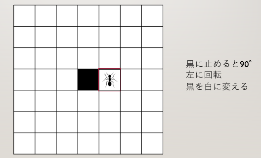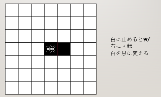 ラングトンの蟻です。「白と黒の格子でできた平面上を仮想的な蟻が動く様子を観察したもの