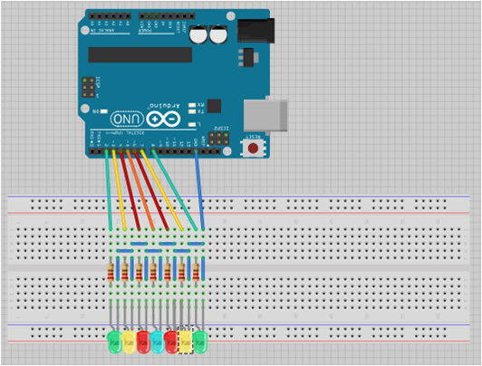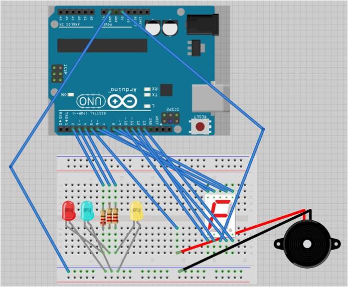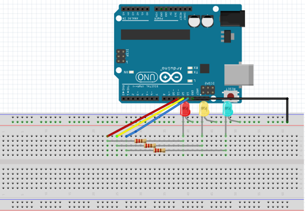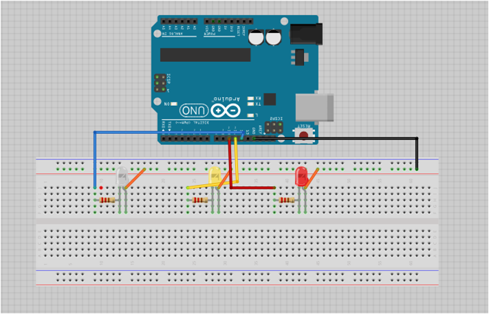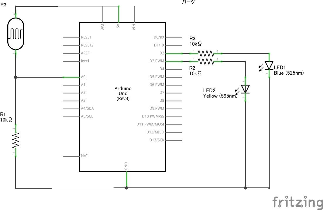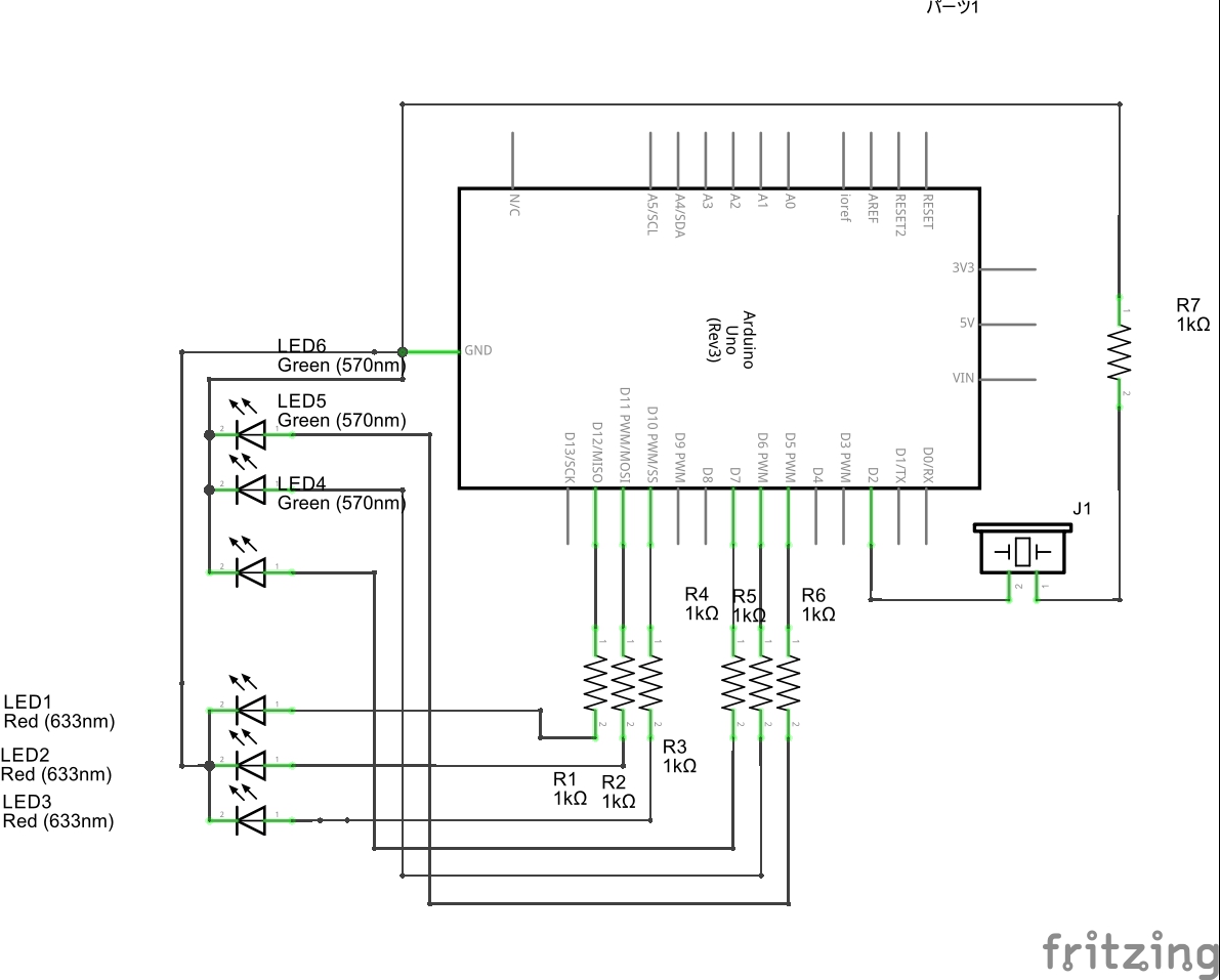 Arduinoとの連携では簡単な信号機を作成した。内容としてはmathematicaにボタンを3つ作成しそれぞれを青、黄、赤の信号の起動スイッチとしてスイッチを押すとそれぞれの色から青10秒、黄2秒、赤10秒の間隔でこの色の順番で点灯と消灯を繰り替えさせるようプログラムした。