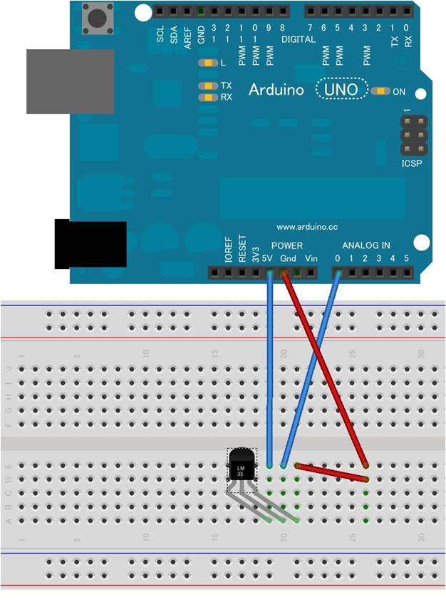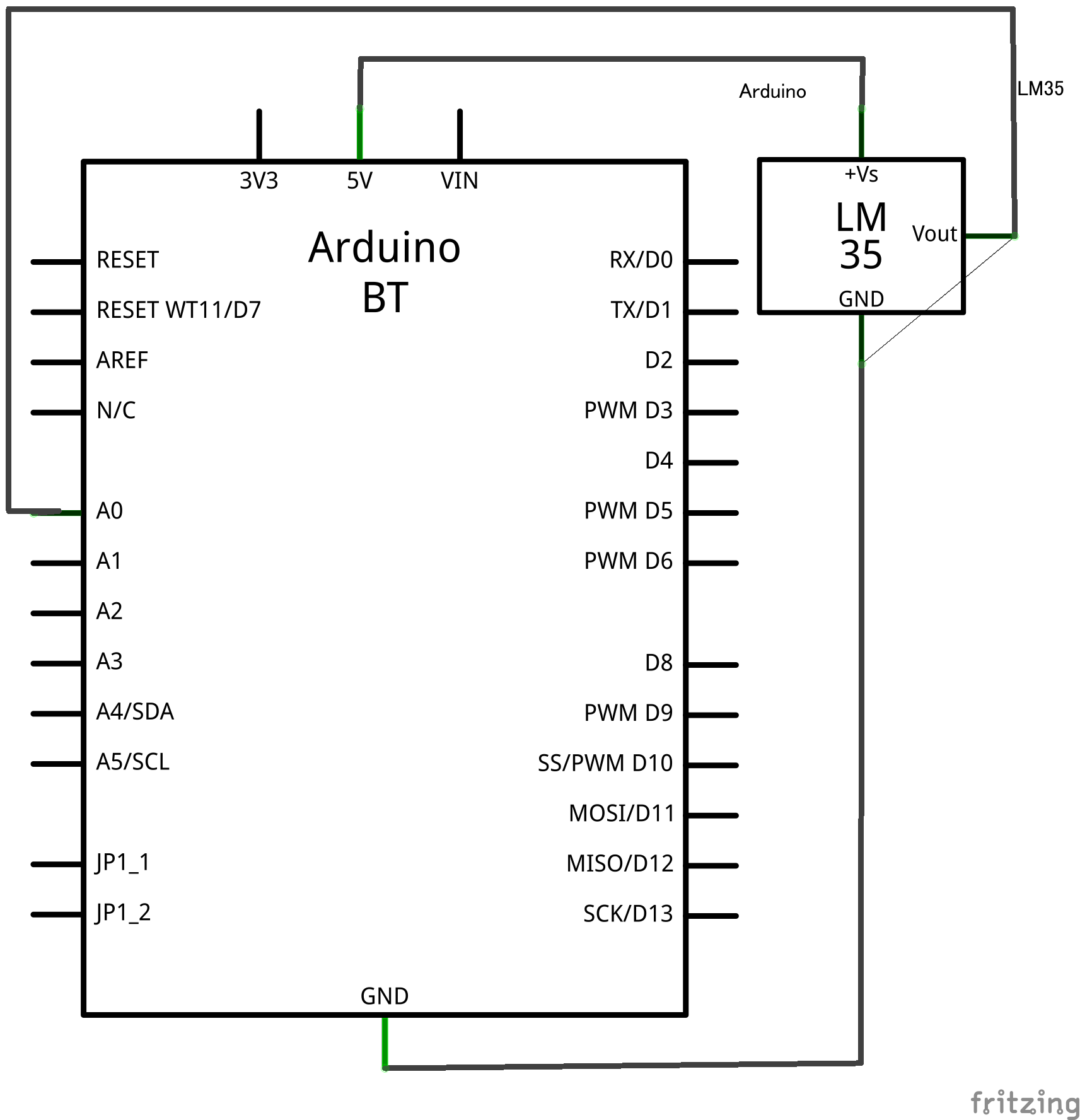 Arduinoからブレッドボードに接続された温度センサ(LM35DZ)の 温度の値を読み取り、リアルタイムで表示させるというもの。指で暖めて、メーターが上がる様子を示してくださいました。