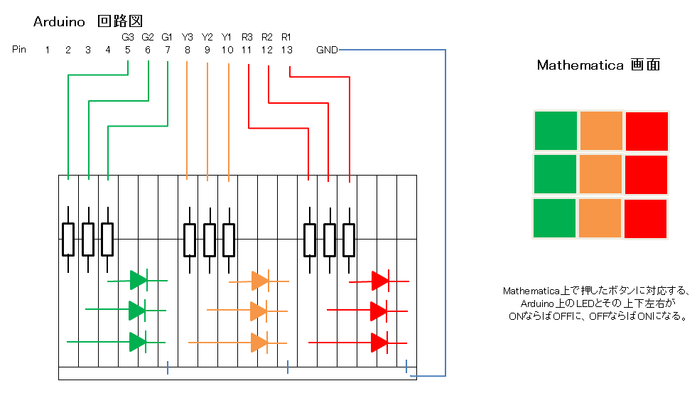 Mathematicaの画面上でボタンを押すとその隣接したLEDが反転します。