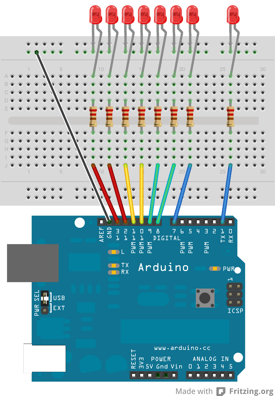 Mathematica上で動くsin関数にあわせてブレッドボード上のLEDを点灯させる。